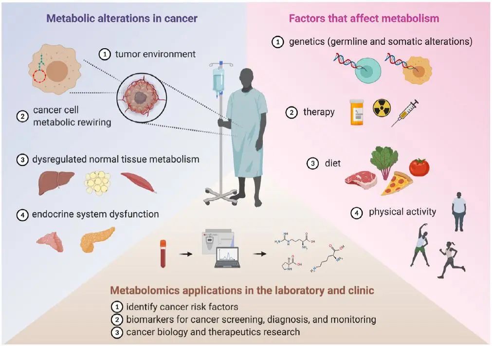 癌症对机体代谢有多种影响,包括细胞内的代谢重组以使癌细胞异常增殖从而适应肿瘤微环境,以及诱导正常组织代谢水平变化。随着人们对PET分子成像技术(主要检测氟脱氧葡萄糖)可作为许多癌症治疗重要工具的认知的提升,生物体系中的其他代谢物也已经逐渐成为癌症诊断、监测和治疗的焦点。