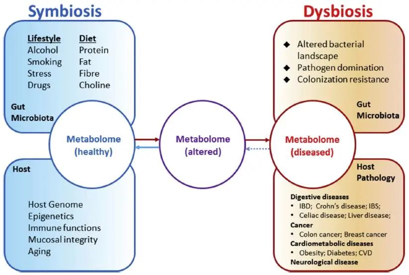 人体的代谢能力涉及肠道微生物群和宿主细胞之间的复杂相互作用。这些基于代谢产物生成的相互作用从个体出生时即已开始。小分子代谢物,比如维生素、脂肪酸、氨基酸(AAs)和胆汁酸,通过与特定宿主膜或核受体结合来调节宿主肠道代谢稳态。肠道微生物群促进了人类免疫系统的发展,而免疫系统反过来又塑造了微生物群的组成。