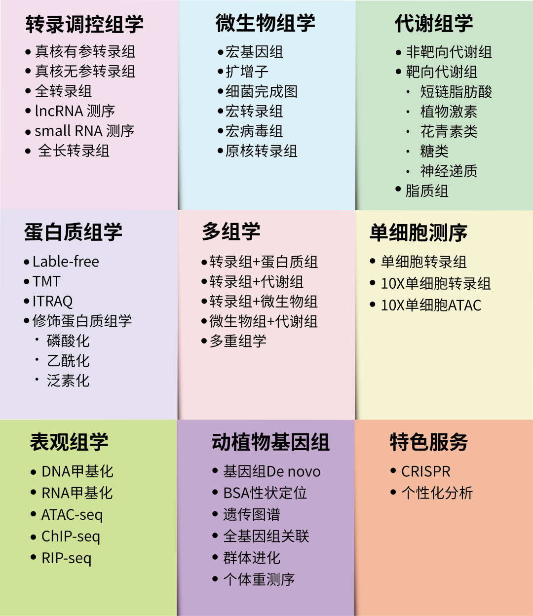 为您提供包括转录调控组学、蛋白代谢组学、微生物组学、基因组学、单细胞组学以及针对各种组学的个性化分析服务,是客户身边值得信赖的科研服务管家。