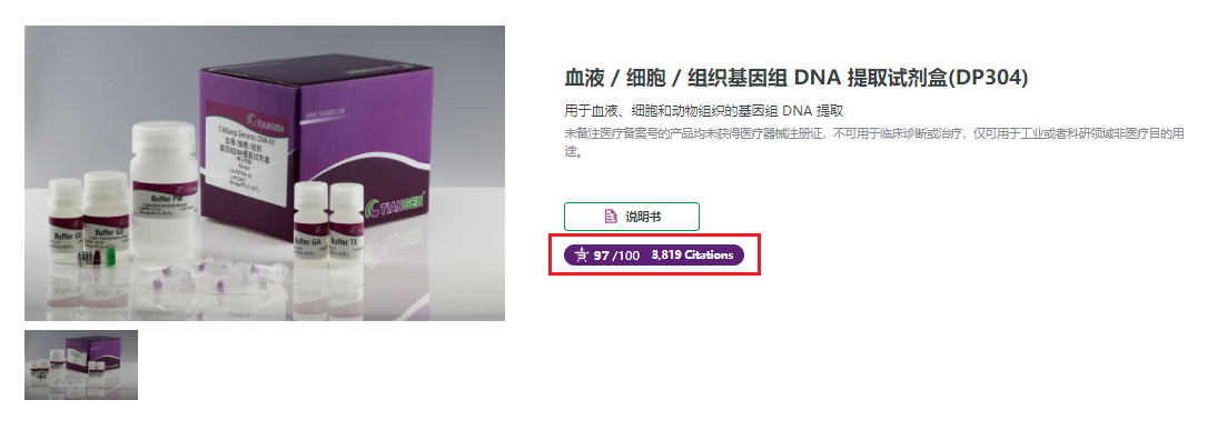 通过TIANGEN官网进入产品详情页,如果产品图片右侧显示紫色按钮,则该产品可通过引文数据库查找相关引用文献,点击按钮即可跳转查看相关引文。