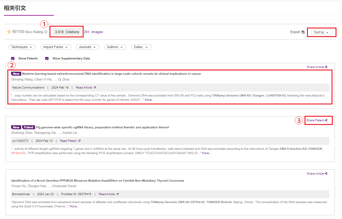 展示了被引用文章的标题、作者、期刊、发表时间,以及提及TIANGEN文献的字段(高亮/加粗),方便您快速浏览和选择感兴趣的文章。