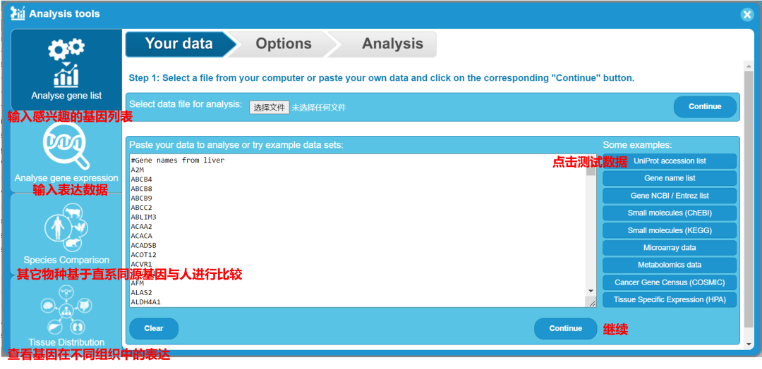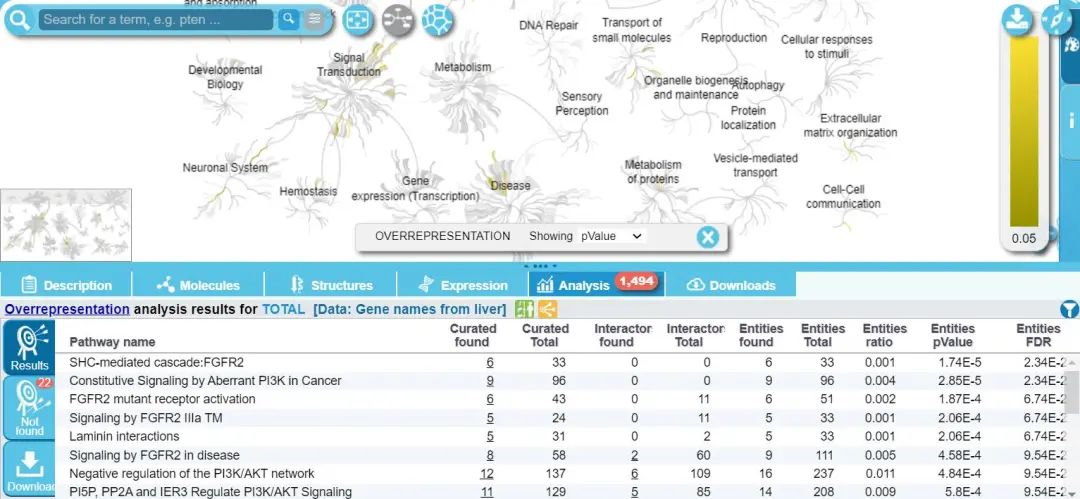 当(中国)网站首页从公司得到高通量分析的初步结果后,可以根据一定的条件找到一些关心的基因(比如差异显著的top20的基因),这时可以通过该模块进行深入的分析。以“Analyse gene list”分析为例,输入测试数据之后,可以得到通路富集的结果,可选择pValue或FDR小于0.05的进行可视化展示。