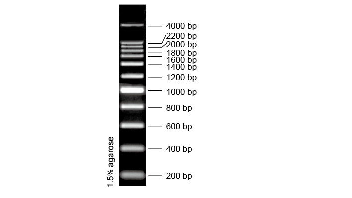 200 bp DNA Ladder 是由单独制备的 PCR 产物混合而成,共有 12 条 DNA 片段,已加入上样缓冲液,可直接电泳,每次上样 6 µl,为便于电泳后观察,1000 bp 条带最亮,每次用量约为 100 ng,其它条带的 DNA 每次用量约为 50