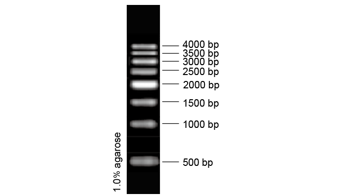 500 bp DNA Ladder 是由单独制备的PCR 产物混合而成,共有8 条DNA 片段,已加入上样缓冲液,可直接电泳,每次上样 6 µl,为便于电泳后观察, 2000 bp 条带最亮,每次用量约为 100 ng,其它条带的 DNA 每次用量约为 50