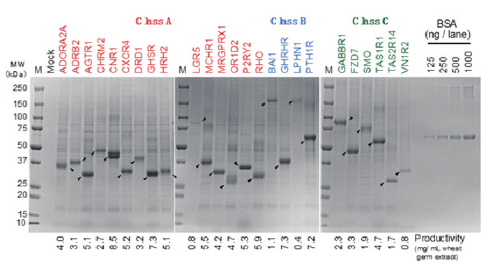 Buffer LM,加入模板后先完成 DNA 的转录,再配合麦胚无细胞蛋白表达系统预混 mix 完成 mRNA 的翻译,该 mix 中包含蛋白翻译的所有必需酶类、各种 tRNA 和离子,加入脂质体之后,目的蛋白能够在脂质体的生物膜上正确合成和组装。本系列试剂盒利用双层液相反应法(Bilayer)表达目的蛋白,每个反应蛋白表达量为 500 µg 左右, 适合 Western Blot、CBB 染色等蛋白检测实验和下游膜蛋白功能解析。