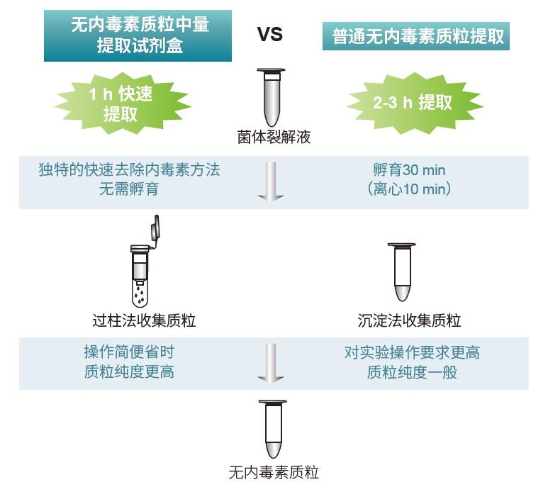 本试剂盒采用独特的硅胶膜吸附技术,高效专一地结合质粒 DNA。 同时采用特殊的溶液 EBT 和过滤器 CS1,可有效的去除内毒素、 蛋白等杂质;整个提取过程仅需 1 h,方便快捷。